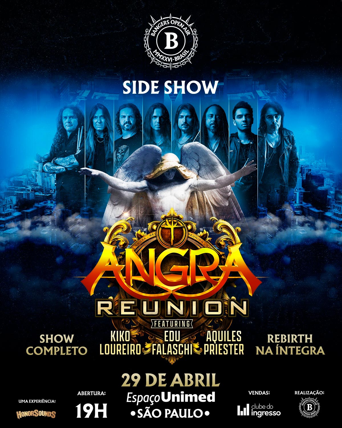 O público terá a oportunidade de assistir à única apresentação da formação “Nova Era” fora do Bangers Open Air, reunindo no mesmo palco Edu Falaschi, Kiko Loureiro, Rafael Bittencourt, Felipe Andreoli e Aquiles Priester.