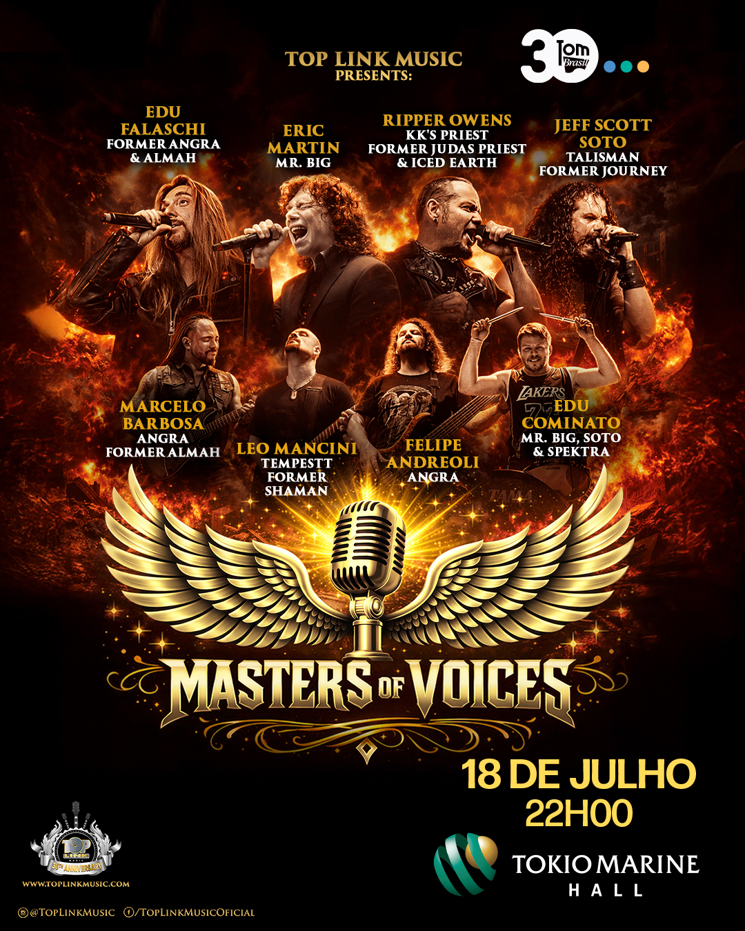 O Masters Of Voices nasce como uma nova super banda que coloca no mesmo palco quatro vocalistas que atravessaram gerações e estilos dentro do rock e do heavy metal. Eric Martin (Mr. Big), Jeff Scott Soto (Talisman, Journey, Yngwie Malmsteen), Edu Falaschi (Angra, Almah) e Tim “Ripper” Owens (Judas Priest/KK’s Priest/Iced Earth) unem forças em um show centrado em grandes sucessos, interpretações marcantes e a força de quatro identidades muito distintas dividindo a mesma noite.