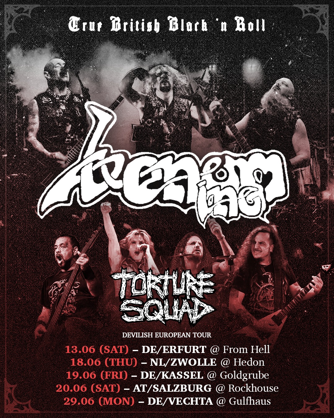 A ‘Devilish European Tour’ com Venom Inc. tem início no dia 13 de junho em Erfurt, na Alemanha, passando pela Áustria, Países Baixos e encerra dia 29 de junho em Vechta, também na Alemanha. Outras datas serão anunciadas em breve, incluindo participações especiais em shows de grandes nomes do metal mundial.