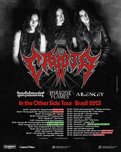 Crypta: A banda brasileira de Death Metal Crypta foi fundada pela baixista e vocalista Fernanda Lira e pela baterista Luana Dametto, com o objetivo de explorar livremente sua identidade musical no gênero. A formação inicial se consolidou em quarteto com a adição das guitarristas Sonia Anubis e, posteriormente, Tainá Bergamaschi, fazendo sua apresentação oficial ao público em 2020 e marcando o início de sua carreira promissora.