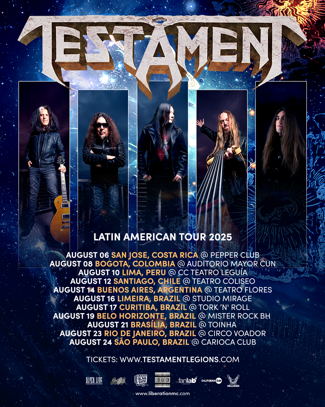 Titã do thrash metal mundial e uma das bandas mais importantes da história da música pesada, o Testament retorna à América Latina no próximo mês de agosto, com seis datas no Brasil: Limeira/SP (16/08), Curitiba/PR (17/08), Belo Horizonte (19/08), Brasília/DF (21/08), Rio de Janeiro/RJ (23/08) e São Paulo (24/08). A realização é da Liberation Music Company.