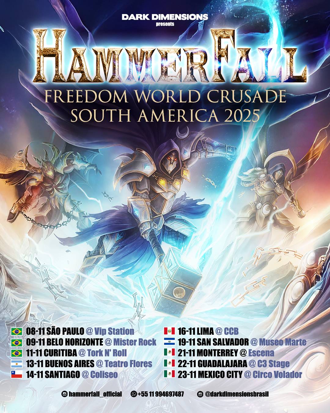 A produtora Dark Dimensions confirma o retorno do lendário HammerFall à América Latina com a turnê Freedom World Crusade South America 2025, trazendo toda a força épica e melódica que consagrou a banda sueca como um dos maiores nomes do Heavy/Power Metal mundial. No Brasil, o grupo fará três apresentações imperdíveis: