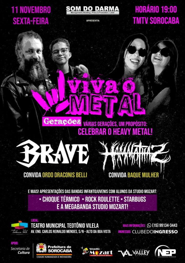 “Viva O Metal – Gerações” será realizado no dia 11 de Novembro a partir das 19h no Teatro Municipal Teotônio Vilela em Sorocaba/SP. Haverão shows especiais de duas já experientes bandas: o Brave que, durante seu set, contará com a participação especial do grupo de performance medieval Ordo Draconis Belli, e o Hammathaz que convida para uma participação muito especial a unidade de Sorocaba do grupo feminista de maracatu Baque Mulher.
