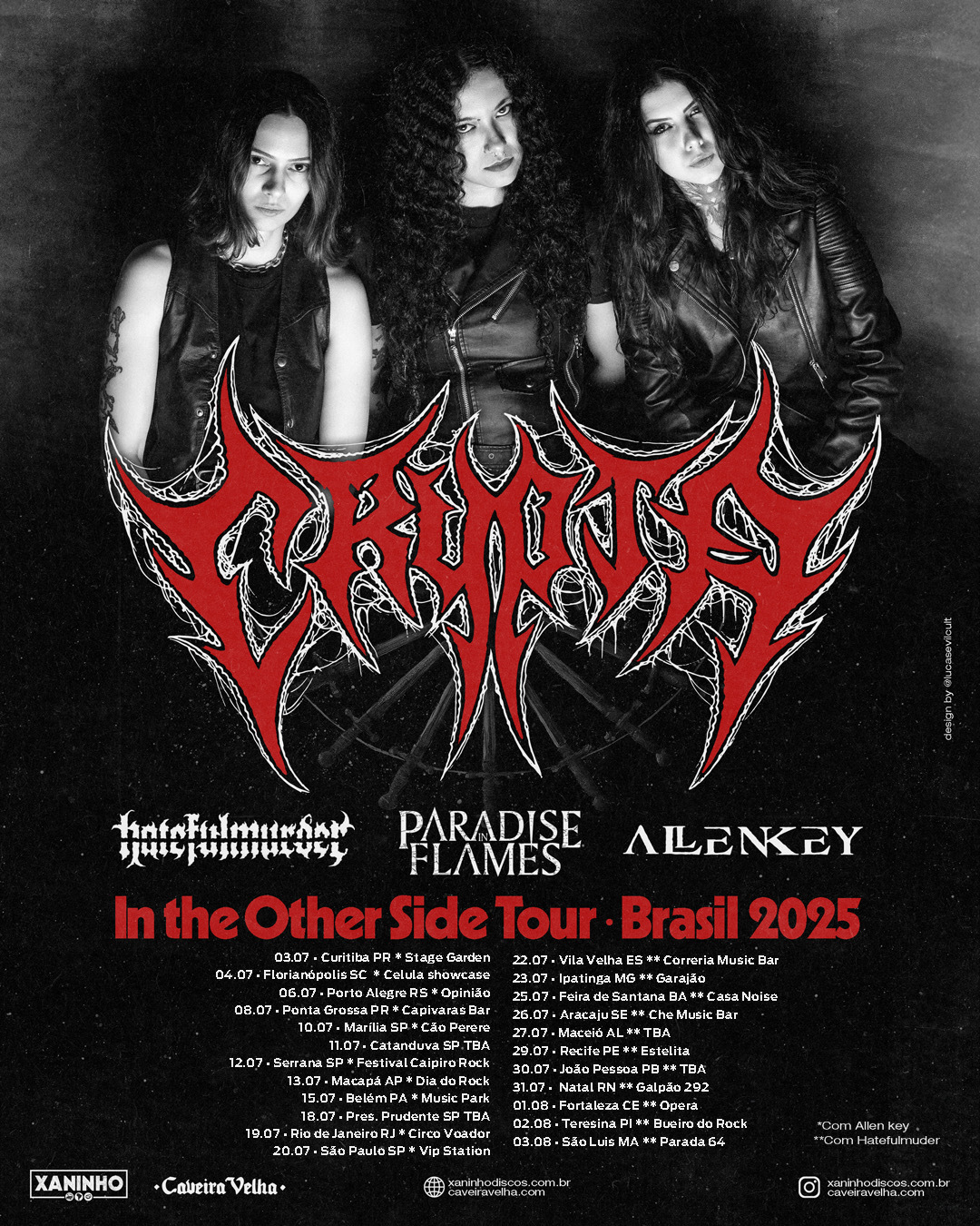 Após uma intensa maratona de 12 shows pelas regiões Sul e Sudeste, a CRYPTA inicia a segunda fase da “In The Other Side Tour – Brasil”, agora com datas confirmadas no Norte e Nordeste. A turnê conta com a companhia das bandas Paradise In Flames (MG) e Hatefulmurder (RJ).