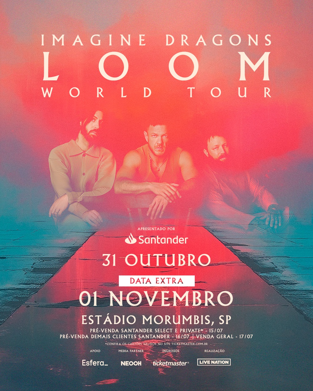Data: 8 de novembro de 2025 Local: Vibra São Paulo Endereço: Av. das Nações Unidas, 17955 – Vila Almeida, São Paulo – SP, 04795-100 Abertura dos portões: 19h Horário do show: 21h Classificação etária: 16 anos desacompanhado. Menores de 16 anos apenas acompanhados dos pais ou responsáveis legais. Sujeito a alteração por decisão judicial. Limite de ingressos: 6 ingressos por CPF, limitado a 2 ingressos meia-entrada. Venda geral: 8 de agosto de 2025, às 10h. Bilheteria oficial (sem taxa de serviço): Estádio do Morumbi | Bilheteria – Av. Giovanni Gronchi, 1866 – São Paulo/SP Funcionamento: Terça a sábado – das 10h às 17h (não funciona aos domingos, feriados, vésperas de feriados, dias de jogos ou eventos de outras empresas).