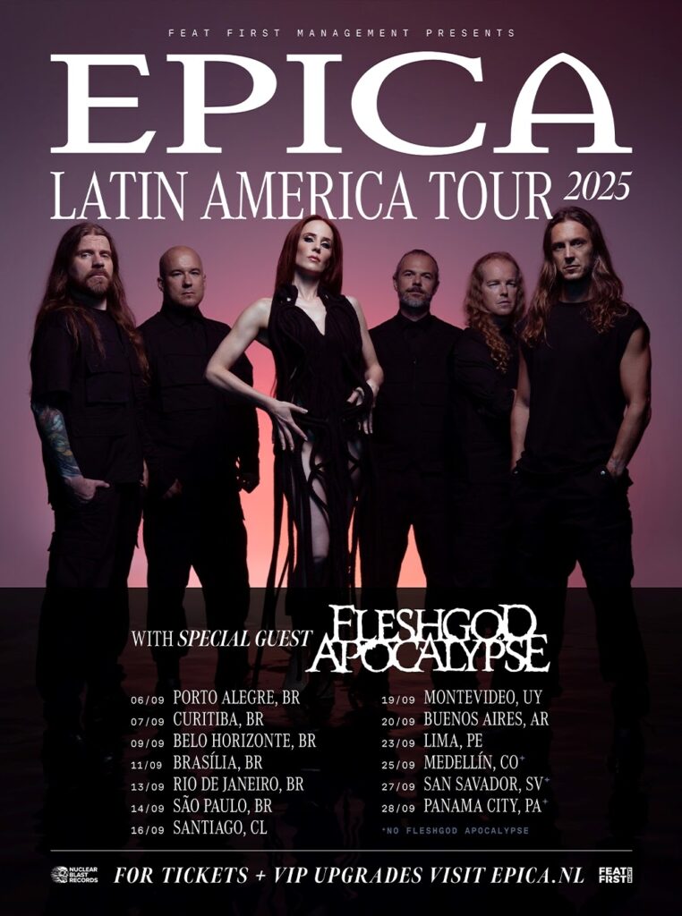 Liderado por Simone Simons (vocal) e Mark Jansen (guitarra), o EPICA tem mais de 20 anos de estrada e 400 milhões de streams no catálogo. Conhecida pelos sons orquestrais, vocais operísticos e riffs pesados, a banda é dona de hits como “Cry for the Moon” e “Sensorium”. Além disso, a banda tem uma longa relação com o Brasil (o segundo lugar no mundo que mais ouve a banda): já são 35 shows realizados no país (incluindo o próprio festival, Epic Metal Fest, realizado somente no Brasil e Holanda) e a banda retorna com datas em Porto Alegre, Curitiba, Belo Horizonte, Brasília, Rio de Janeiro e São Paulo.