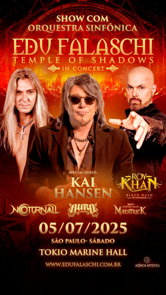 Serviço: Edu Falaschi + Roy Khan & Maestrick + Noturnall + Auro Control Data: 5 de julho de 2025 (sábado) Horário: Abertura dos portões às 20h Local: Tokio Marine Hall – Rua Bragança Paulista, 1281 – São Paulo/SP Ingressos: http://www.ticketmaster.com.br